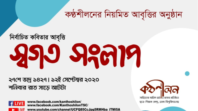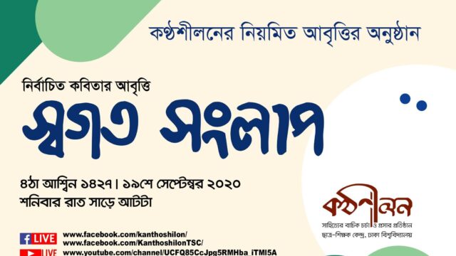 নির্বাচিত কবিতার আবৃত্তি “স্বগত সংলাপ” ১২ই সেপ্টেম্বর ২০২০ শনিবার রাত ৮:৩০ মিনিট থেকে রাত ৯:৩০ মিনিট ফেসবুক লাইভ … বিস্তারিত »