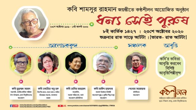 শামসুর রাহমান জয়ন্তীর অনুষ্ঠান “ধন্য সেই পুরুষ” ২৩শে অক্টোবর ২০২০ শুক্রবার রাত ৮:৩০ মিনিট থেকে রাত ১০:৩০ মিনিট ফেসবুক লাইভ … বিস্তারিত »