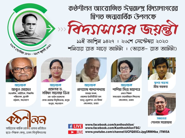 সাহিত্যিক ও সমাজ সংস্কারক ঈশ্বরচন্দ্র বিদ্যাসাগরের দ্বিশত জন্মবার্ষিক উদ্যাপিত হচ্ছে এই বছর। এই উপলক্ষে গত ১১ই আশ্বিন ১৪২৭ / ২৬শে সেপ্টেম্বর ২০২০ শনিবার রাত সাড়ে আটটায় ফেসবুকে সরাসরি সম্প্রচারিত হল কণ্ঠশীলনের আয়োজনে “বিদ্যাসাগর জয়ন্তী” নামক অনুষ্ঠান।